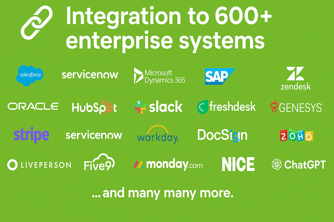 We’ve developed a major technical enhancement to our platform architecture via some new integration apps. This strategic development enables DLP’s Chatbot+™, Voicebot+™, and Livechat+™ solutions to connect instantly with over 600 widely-used enterprise applications — including Salesforce, Zendesk, Dynamics 365, Genesys, SAP, and Stripe.